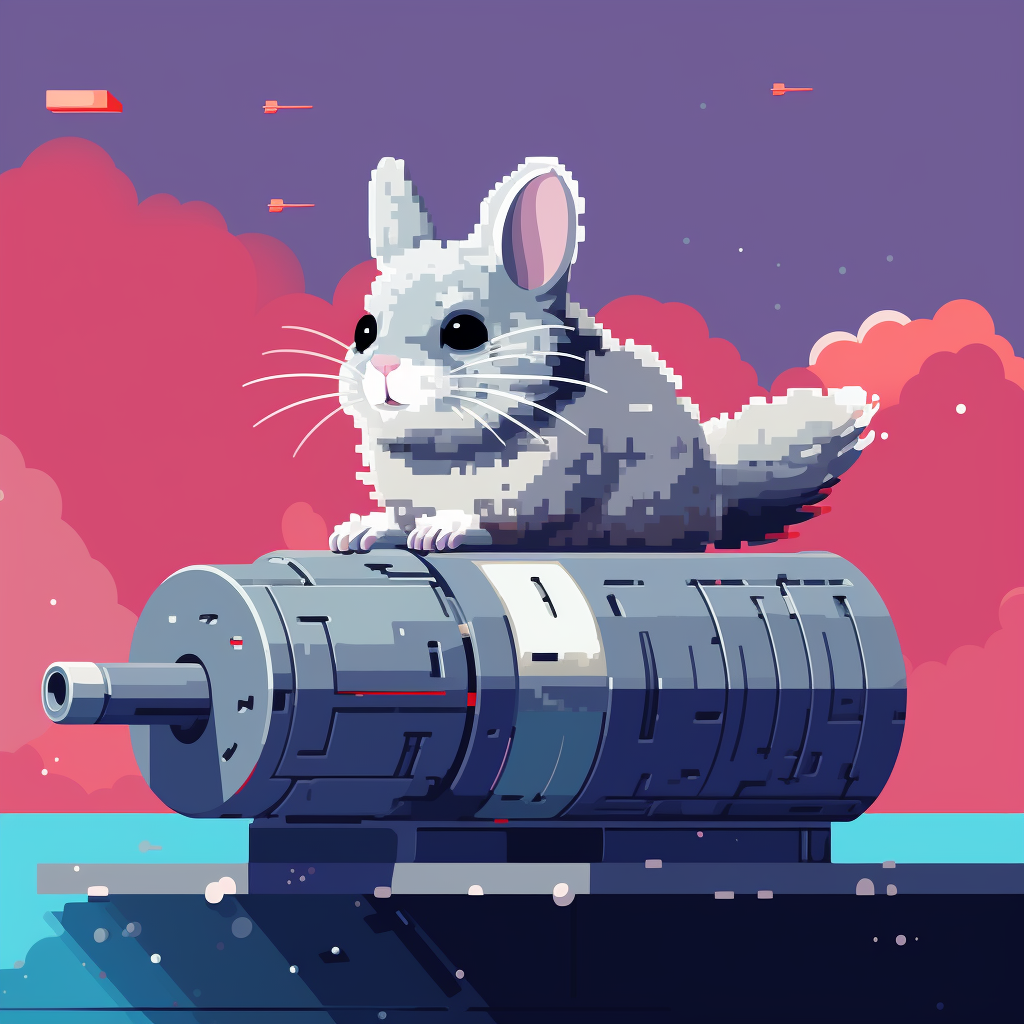 Pixel Art, a cute grey chinchilla sittings on a missle in the space.